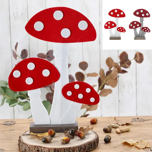 Filz-Pilze auf Holzsockel, stehende Pilze 41cm, Set mit 2, rustikale Dekoration für Zuhause