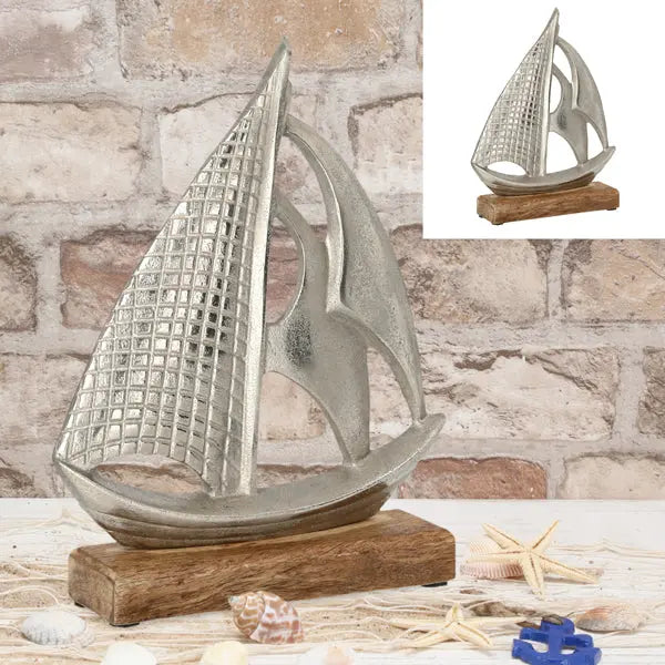 Entdecken Sie das exquisite Segelboot, das mit seinem atemberaubenden Silberdesign und dem eleganten Holzfuß die perfekte maritime Dekoration für Ihr Zuhause darstellt.