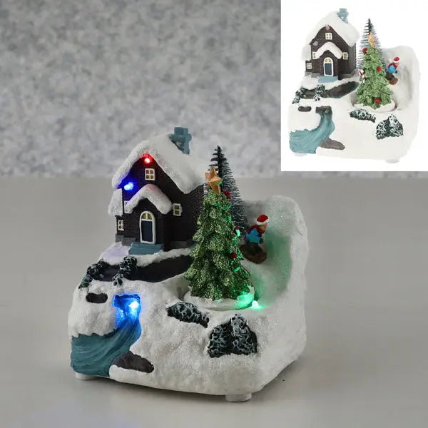 LED-lit Christmas tree in winter landscape, festive miniature, 12x14cm