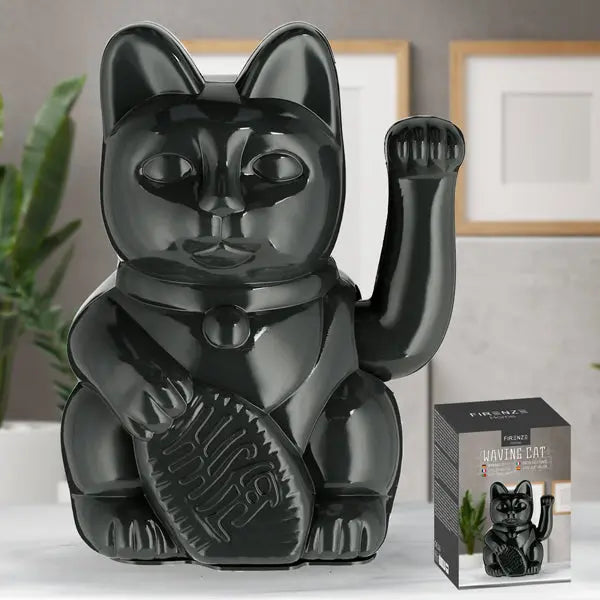 Szczęśliwy, czarny, machający kot ma ok. 21 cm wysokości i lśni elegancką czernią. Symbolizuje szczęście i dobrobyt i jest wykonany z trwałego i wysokiej jakości materiału. Koci mechanizm pozwala na delikatną falę witającą gości, idealną do użytku w domu, biurze lub firmie, aby przyciągnąć szczęście i odpędzić negatywne emocje.