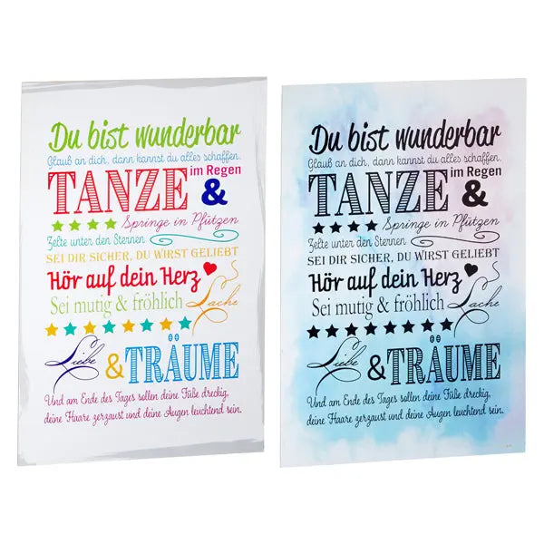 Każdy obraz ma idealny rozmiar 40 x 60 cm i dlatego idealnie pasuje do powierzchni ścian. Zestaw zawiera dwa różne obrazy, które harmonijnie się uzupełniają i umożliwiają urozmaiconą aranżację.