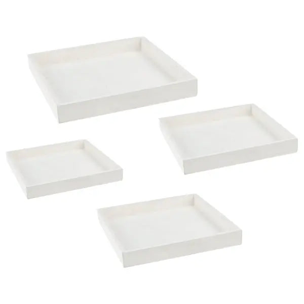 Zestaw 4 kwadratowych drewnianych tac stanowi wszechstronne rozwiązanie do serwowania posiłków w Twoim domu. Dzięki wyrazistemu białemu wykończeniu nadają każdemu pomieszczeniu jasny i elegancki wygląd, który podkreśli zarówno nowoczesne, jak i tradycyjne wnętrza. Różne rozmiary umożliwiają stylowe podawanie i porządkowanie jedzenia i innych przedmiotów. Wykonane z trwałego drewna, tace są solidnie zbudowane i łatwe w utrzymaniu, idealne do codziennego użytku. Ich prosta konstrukcja dodaje dyskretnej elegancji każdemu pomieszczeniu, dzięki czemu są wszechstronnym dodatkiem do Twojego domu.