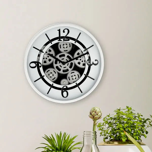 Weiße Zahnrad-Wanduhr, 30cm Durchmesser – Elegantes mechanisches Zeitmesser